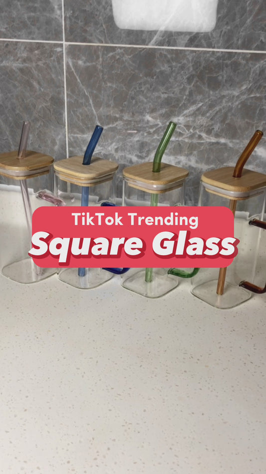400ml TikTok Trending Square Glass Cup with Bamboo Lids and Glass Straws